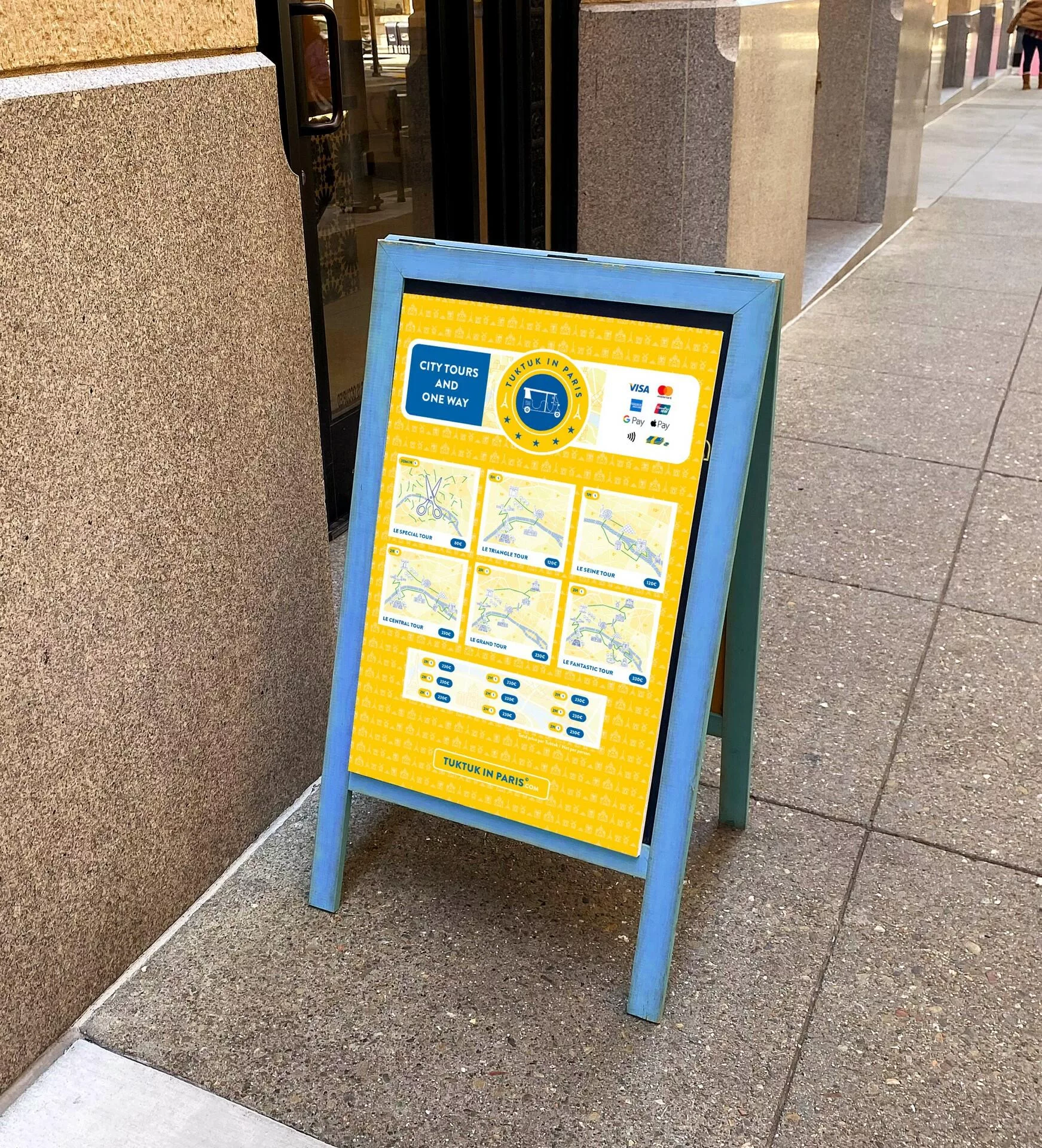 TukTuk in Paris is a fun and unforgettable way to discover Paris and its monuments by TukTuk. I designed the logo, the website, the graphics elements as brochures, boards, maps, icons, pattern and stickers!